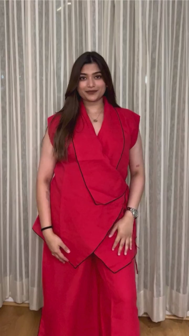 Summer Cotton Linen Blend Wrap Top and Pants with Black overlock detailing, modern dress for women and western dress for women.